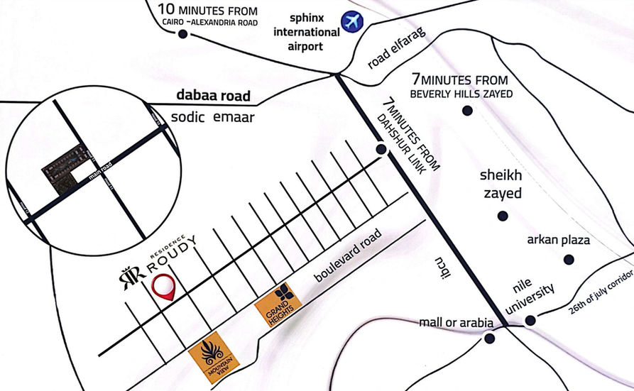 Roudy Residence is located 7 minutes away from Waslet Dahshour Road, commanding a strategic location in Central Green Belt October with direct access to and from Middle Ring Road and Sheikh Zayed City.